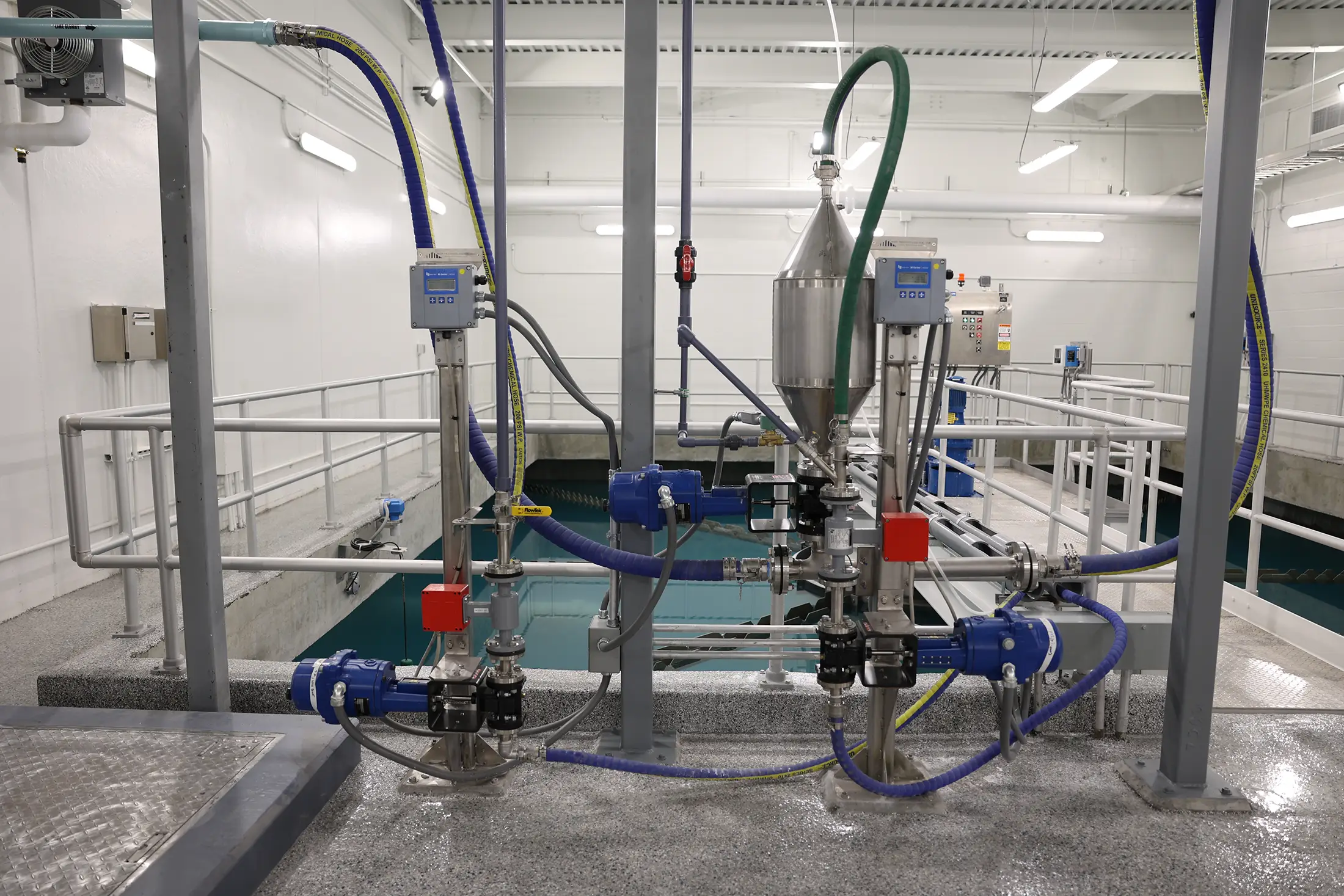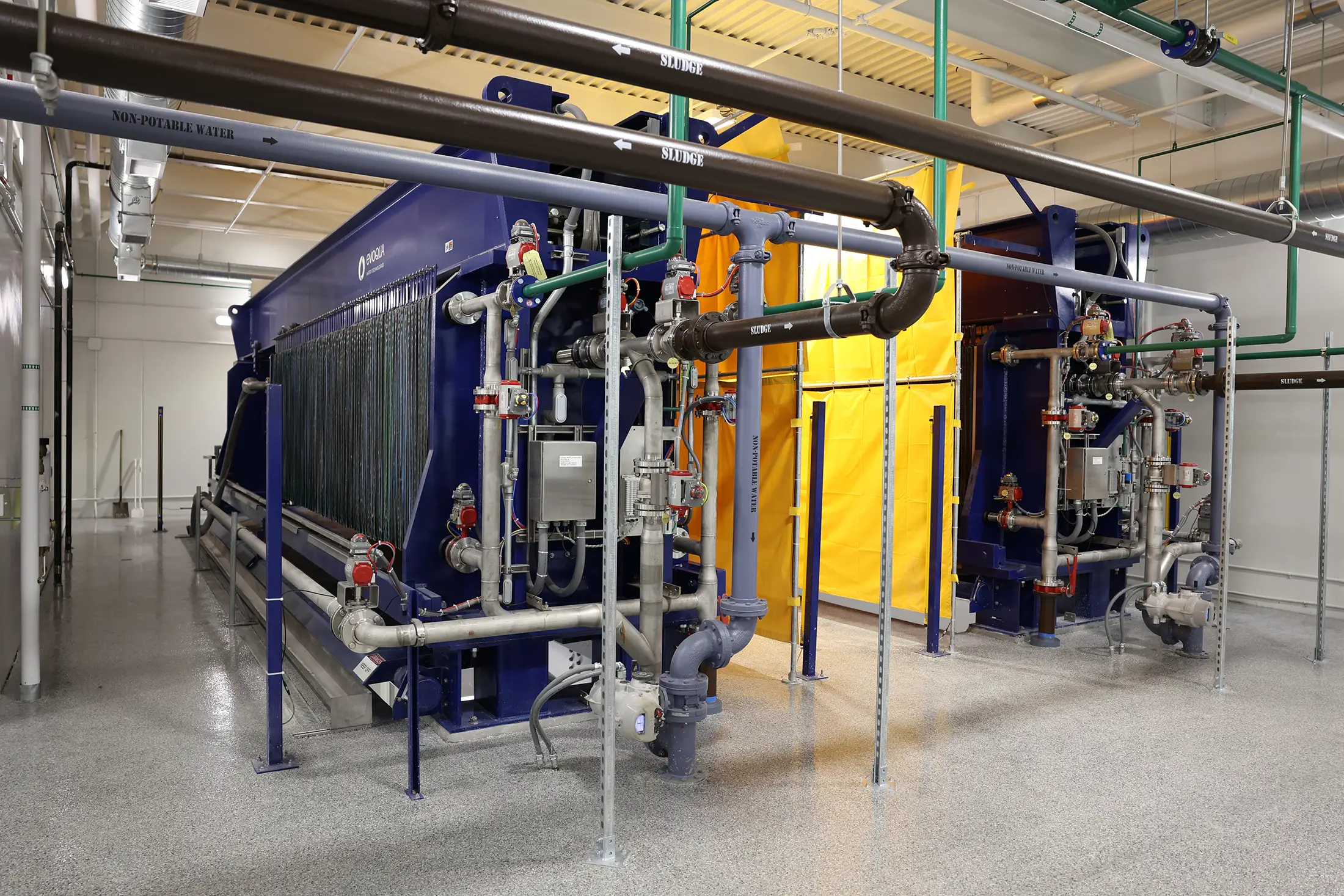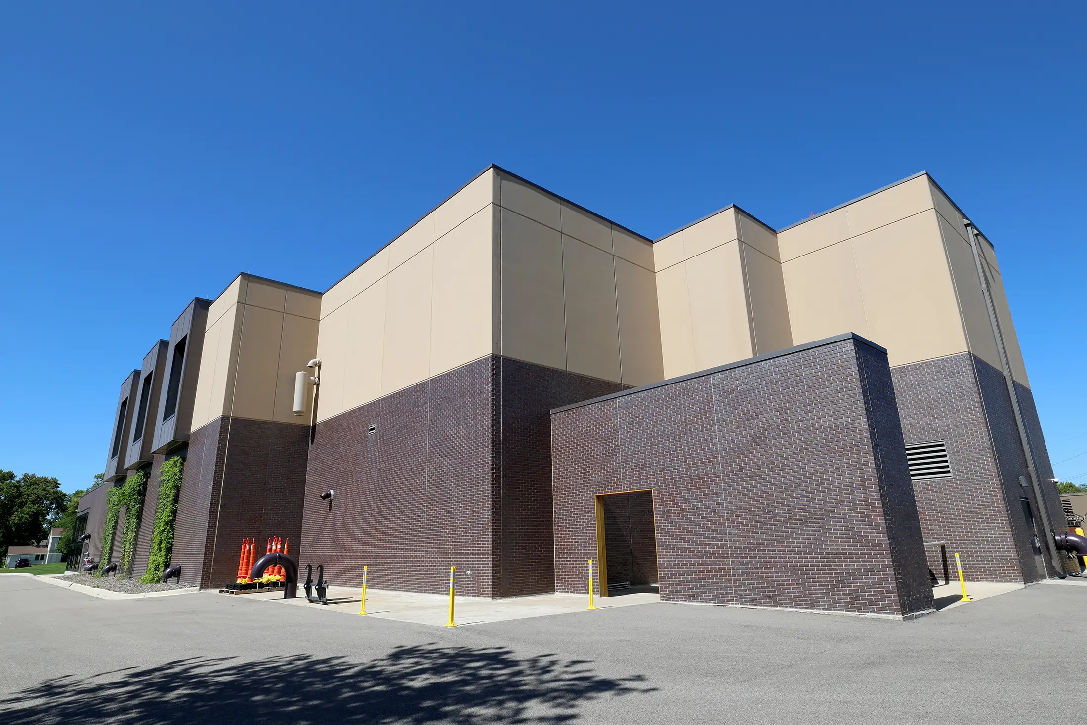 In addition, the site has green features to minimize its environmental footprint. A green roof with foliage captures rainfall, while a pollinator garden and a stormwater pond ensures no stormwater leaves the site. In the future, solar panels will be installed on the roof of the water treatment plant and hops will be grown on the outdoor trellis with the intent of making them available to the local breweries.